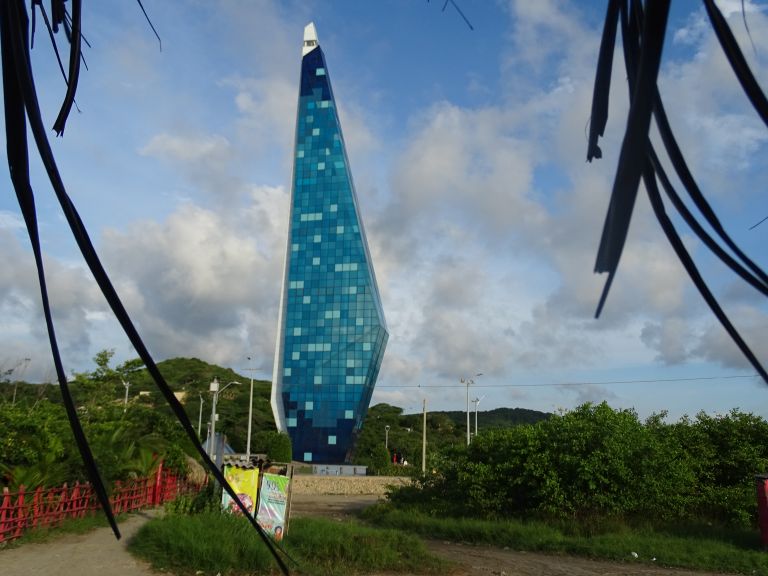 Der 2020/23 erbaute 70m hohe El Faro in Puerto Colombia stellt ein stilisiertes Segelschiff dar …